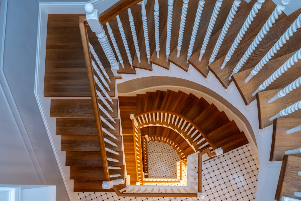 Spiralne, drewniane schody z białą, toczoną balustradą stanowią prawdziwą ozdobę domu.