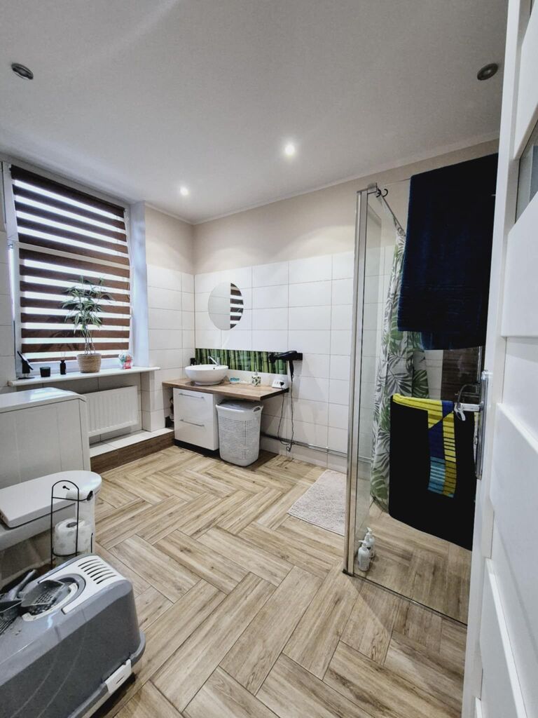 – dużej łazienki z wc, wykonana i wyposażona (kabina prysznicowa), na obecną chwilę łazienka wykonana – nie wpisana w księgę wieczystą,