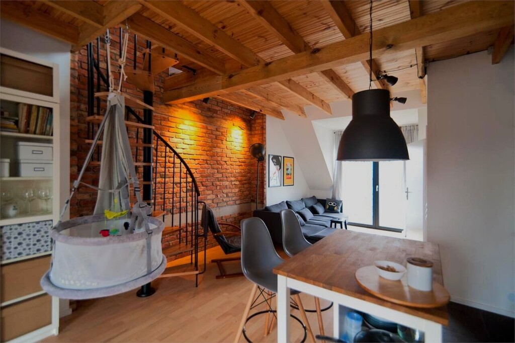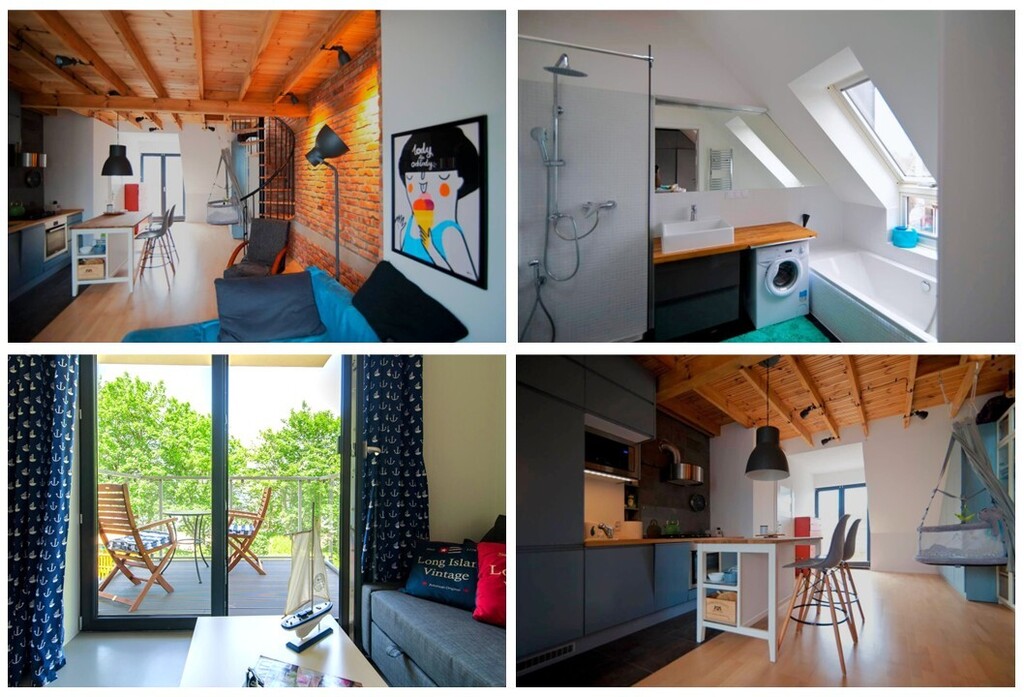 Na drugim piętrze znajdziemy 2 apartamenty o podwyższonym standardzie, w których funkcję sypialną przeniesiono na antresolę, dzięki czemu na dolnym poziomie dostępna jest dużo większa przestrzeń dzienna oraz łazienka z wanną oraz prysznicem. W pełnoprawnej kuchni znalazło się nawet miejsce na piekarnik i mikrofalówkę. Powierzchnia każdego z nich to około 35mkw na dolnym poziomie plus prawie 40mkw na antresoli.