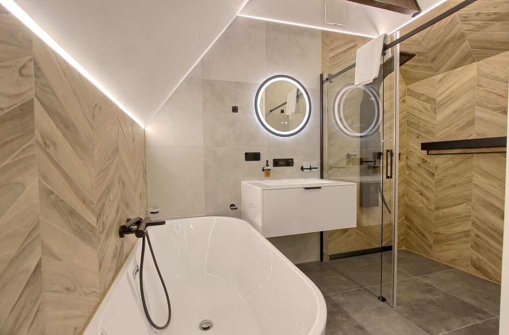 Na górnym poziomie sypialnia z łóżkiem i szafami w zabudowie, łazienka z wanną i kabiną prysznicową.