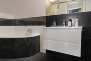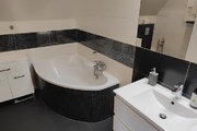 – łazienka z wc wyposażona w dużą wannę, grzejnik drabinkowy oraz miejsce na pralkę,