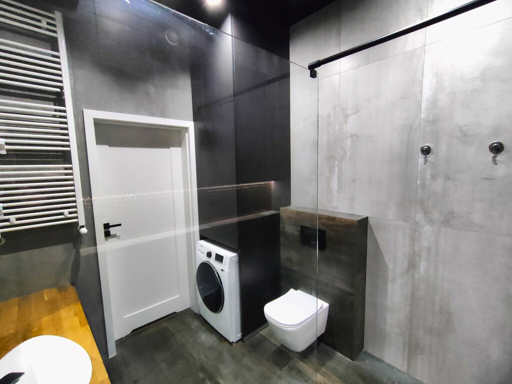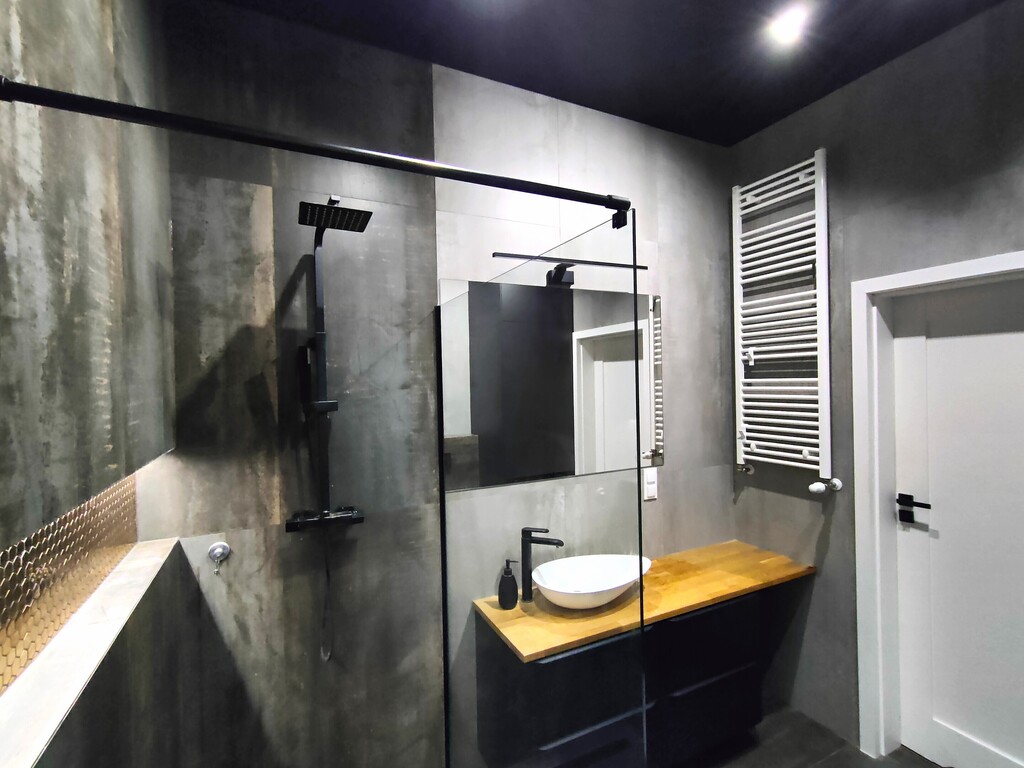 Łazienka w standardzie premium: wielkoformatowe płyty o industrialnym charakterze, czarna armatura, prysznic typu walk-in oraz podświetlane wnęki nadają wnętrzu nowoczesny i minimalistyczny styl.