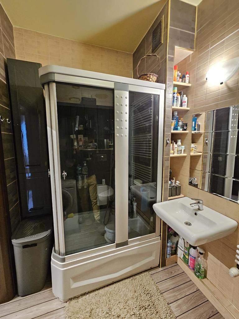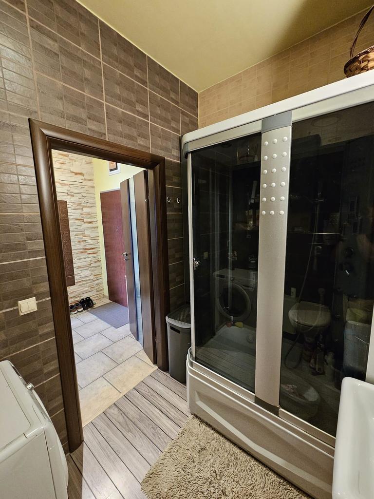 Łazienka wyposażona prysznic wolnostojący, umywalkę, wc i pralkę.