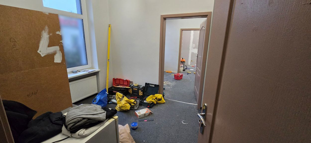 Ściany i sufity gładzone, malowane, na podłogach wykładzina, okna PCV. Aktualnie powierzchnia jest odświeżana po poprzednim najemcy (malowanie ścian, itd.)