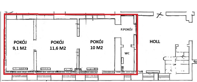 Oferowana powierzchnia 35 m2 składa się z trzech pomieszczeń biurowych (po ok 10 m2) połączonych ze sobą drzwiami wewnętrznymi, przedpokoju i toalety z umywalką.