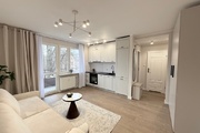 – Salon z aneksem kuchennym, z którego jest bezpośredni dostęp do dużego balkonu (ok. 20 m²),