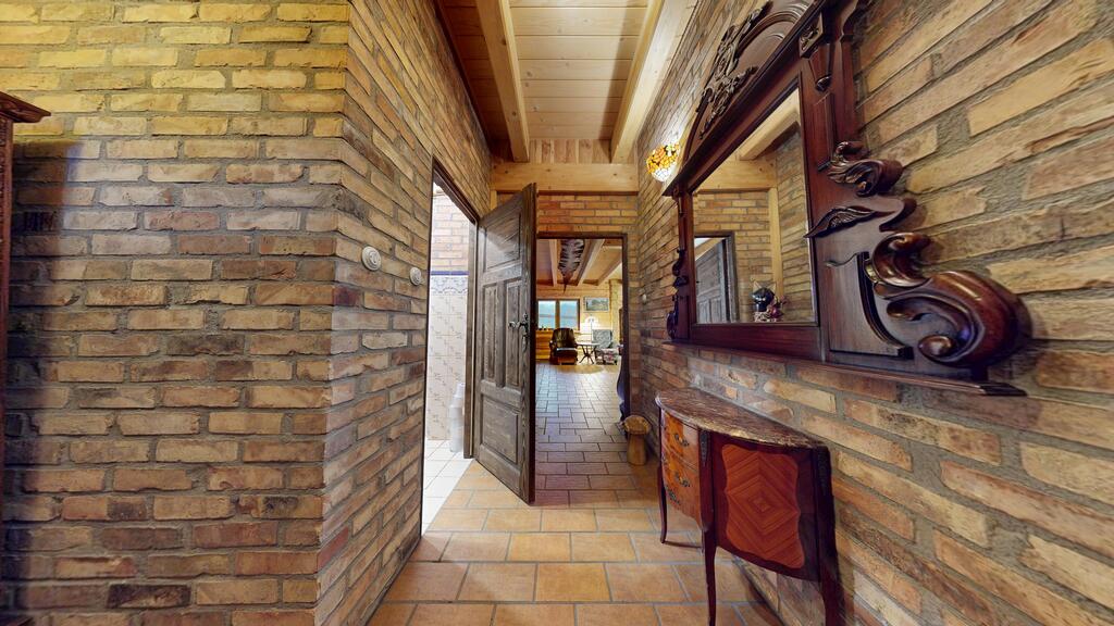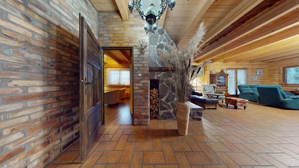 Powierzchnia użytkowa to ponad 220m² gdzie sercem domu jest przestronny, reprezentacyjny salon połączony z kuchnią, urządzony w staropolskim klimacie. Szczególną uwagę zwraca efektowny kominek, stanowiący kluczowy element wnętrza, nadając mu wyjątkowego charakteru z przytulną atmosferę oraz ciepłem domowego ogniska – foto.
