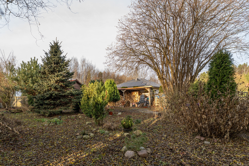 Dom posadowiony jest na działce o powierzchni 733 m², w pełni zagospodarowanej, z licznymi nasadzeniami krzewów oraz drzew owocowych, tworzącymi estetyczną i rekreacyjną przestrzeń.
