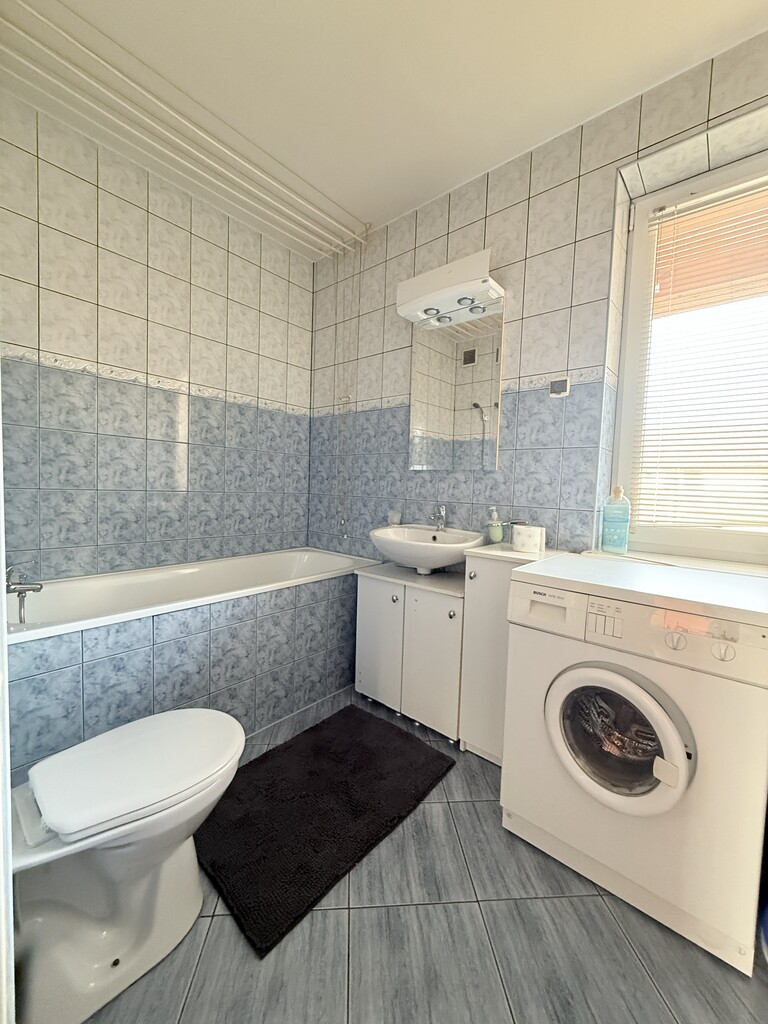 Przestronna łazienka z oknem, w glazurze i terakocie.