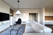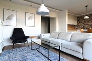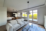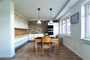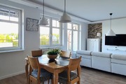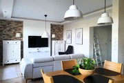 – przestronnego salonu z aneksem wyposażonego w wysokiej klasy sofę z funkcją relaks, TV LCD Samsung, funkcjonalne komody, fotel i stolik kawowy. Pomieszczenie jest bardzo przestronne, doświetlone przez dwa bardzo duże okna oraz drzwi podwójne balkonowe wyposażone w elektrycznie sterowane rolety antywłamaniowe. Aneks posiada zabudowę na wymiar, a na wyposażeniu markowe sprzęty AGD (lodówko-zamrażarka, piekarnik, płyta indukcyjna, zmywarka). Między aneksem a salonem znalazło się również miejsce na stół jadalniany z czterema krzesłami. Na wyposażeniu kuchni znajdziemy kubki, szklanki, zastawę stołową, sztućce, garnki itp.