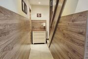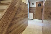 Drewniane schody prowadzą na piętro, nadając wnętrzu ciepły i elegancki charakter.