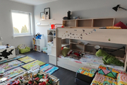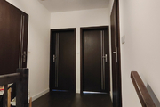Na piętro prowadzą solidne, wylewane schody, wykończone w podobnym stylu jak podłogi. Przestrzeń, ok. 70m2, podzielona została pomiędzy 3 sypialnie oraz dużą łazienkę z oknem. Największa sypialnia, która stanowi obecnie pokój dziecięcy ma ok. 16m2 i posiada dużą szafę w zabudowie. Dwie pozostałe sypialnie, po również ok. 16m2, to słoneczne pomieszczenia, zbliżone kształtem do kwadratu, co sprawa, że są bardzo ustawne. Duża łazienka o powierzchni ok. 10m2 posiada prysznic, wannę, dużą umywalkę z zabudową meblową i miejscem na pralkę oraz suszarkę. W korytarzu znajduje się wyłaz z rozkładaną drabiną na strych, na którym można przechowywać wiele rzeczy.