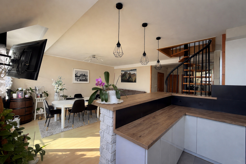 Dwupoziomowy układ zapewnia wygodny podział na część dzienną i prywatną, co znacząco podnosi komfort codziennego życia.