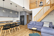 Imponujący salon o wysokości aż 5,5 metra, otwarty na kuchnię i doświetlony wysokimi, dwukondygnacyjnymi oknami. Dzięki temu wnętrze przez cały dzień wypełnia naturalne światło, a przestrzeń daje poczucie swobody, którego nie oferują standardowe mieszkania.