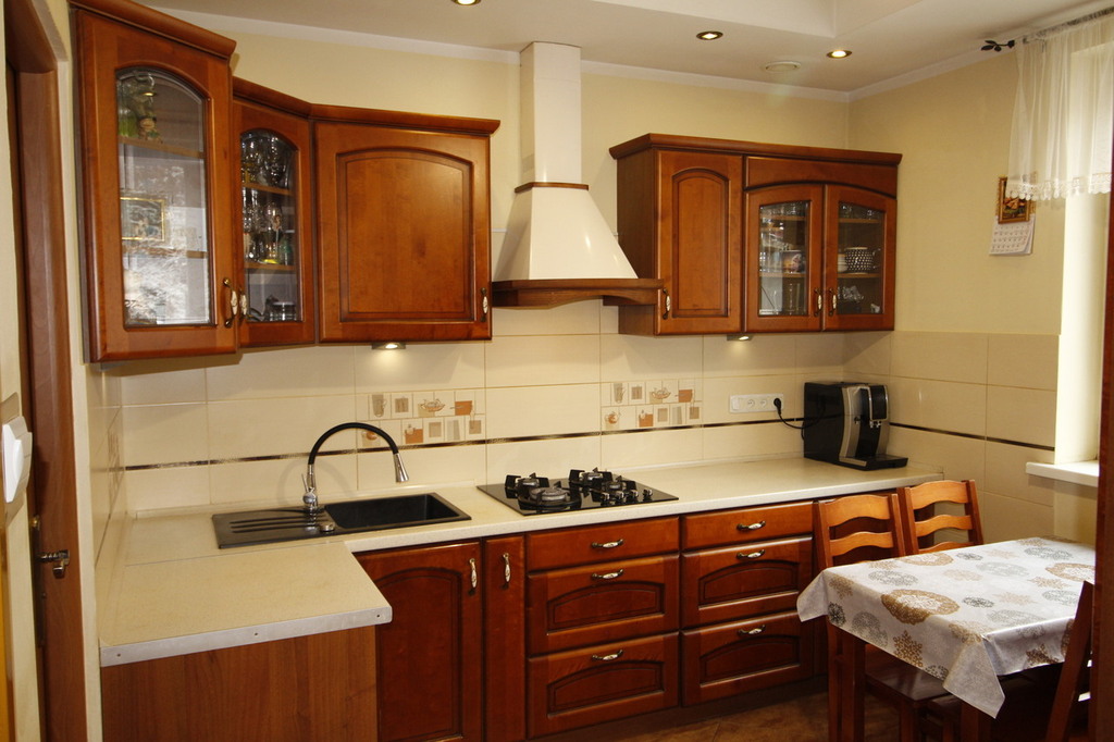 - kuchnia – wyposażona w solidne, stylowe drewniane meble oraz sprzęt AGD: lodówkę, kuchenkę gazową i piekarnik elektryczny;