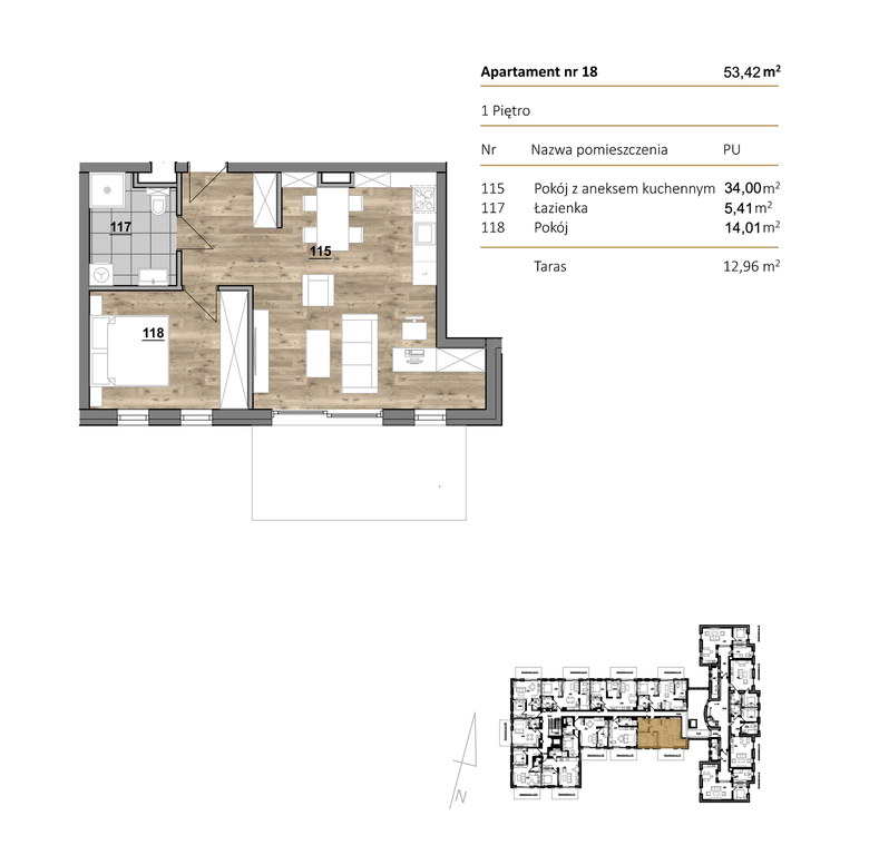 Przedmiotowe mieszkanie nr 18 dwupokojowe o powierzchni całkowitej 53,42mkw składa się z: