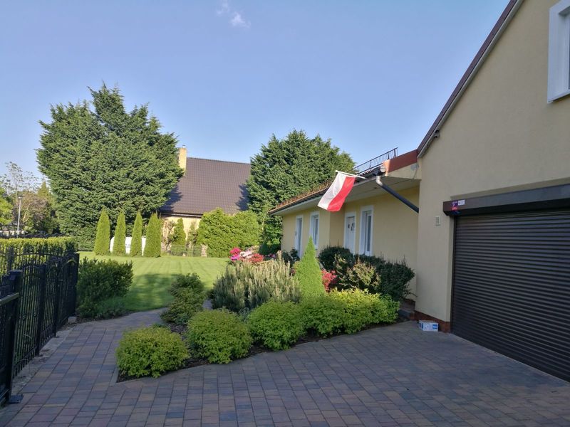 Wykończenie – dwie osobne bramy wjazdowe sterowane pilotem, podjazd wykończony polbrukiem oraz terakotą wewnątrz garażu. Drzwi przeciwpożarowe prowadzące do domu oraz drugie sosnowe.