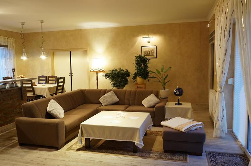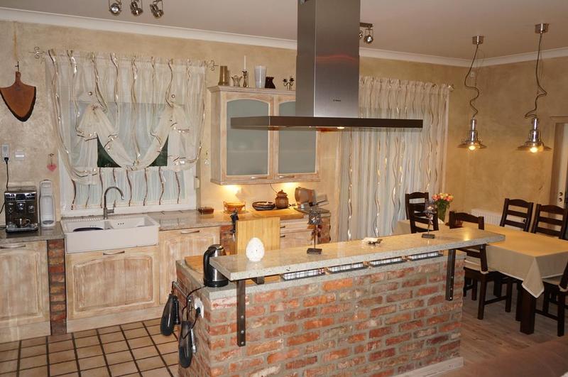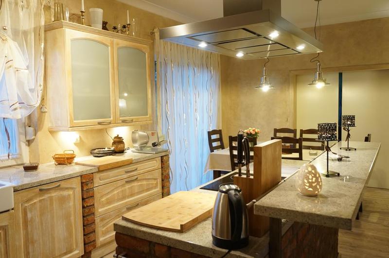 Wykończenie – zabudowa wysokiej klasy meblami z litego drewna oraz granitowymi blatami, na podłodze położona deska bielona oraz kamienna terakota, ściany pokryte tynkiem strukturalnym i malowane.