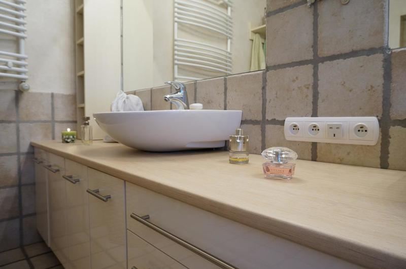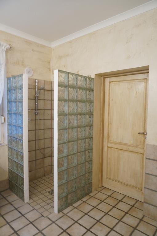 Wykończenie – podłoga i częściowo ściany wyłożone płytkami kamiennymi, na reszcie ścian położony tynk strukturalny,