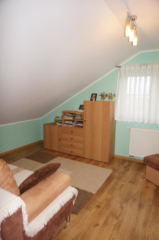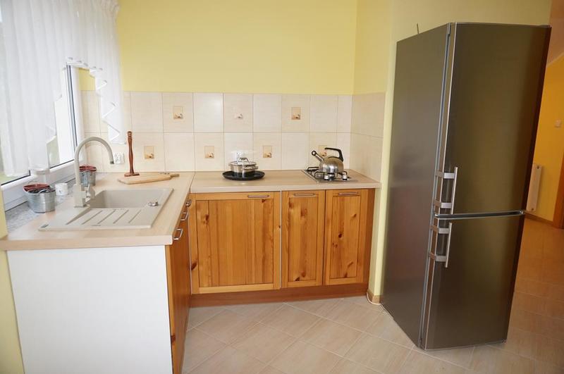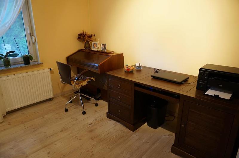 Wykończenie – na podłodze położona deska bielona, ściany gładzone, malowane, stała zabudowa składająca się dwóch dużych szafami typu komandor oraz funkcjonalną szafką na buty z wysuwanymi półkami, znajdującą się pod bukowymi drewnianymi schodami, prowadzącymi do drugiej części domu,