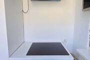 - Kuchnia: widna, w pełni wyposażona w meble oraz sprzęt AGD (płyta elektryczna, piekarnik, lodówka, mikrofalówka).