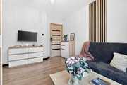 – salon (około 11 m²) – jasny i ustawny, wyposażony w podstawowe meble