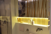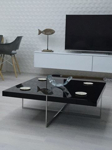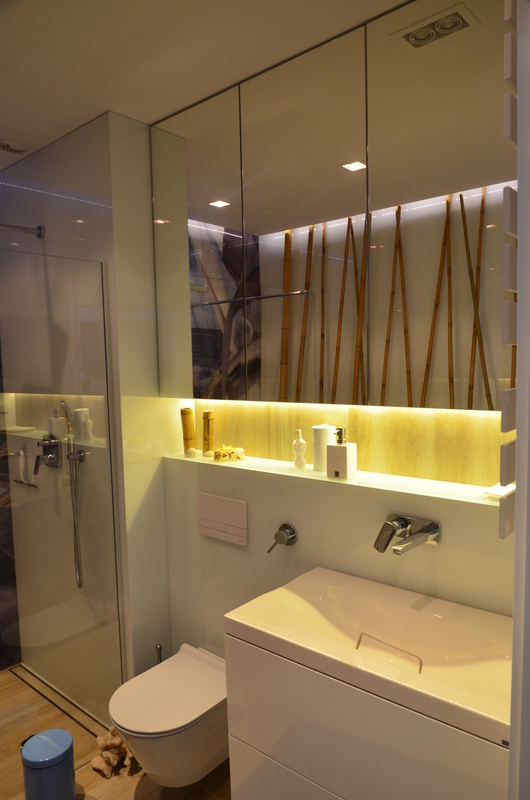Na jednej ze ścian jasne porcelanowe kafle firmy Porcenalosa. W salonie zastosowano oświetlenie sufitu firmy Barisoll, lampy Deltalight i ledy. Zainstalowano system nagłośnieniowy Sound Yamaha @ Jamo. Aneks kuchenny z jasnymi meblami robionymi na wymiar. Wyposażenie kuchenne Villeroy @ Bosch, a sprzęty kuchenne firmy Bosch i Elektrolux – zmywarka, płyta indukcyjna, okap, pralka, piekarnik.